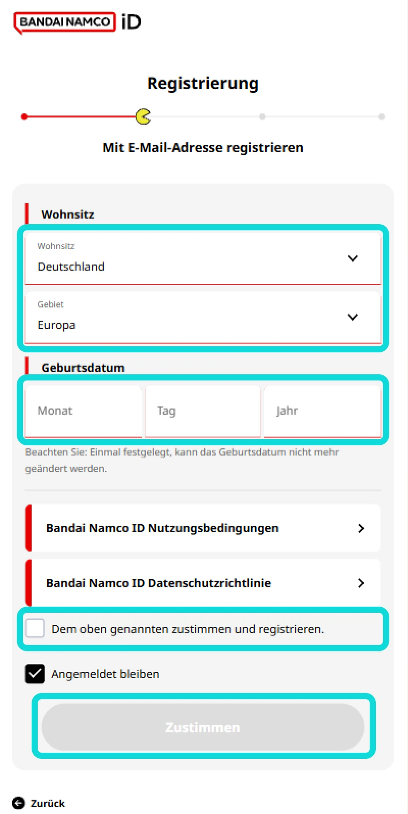 2.2- Wählen Sie Ihren "Wohnsitz" aus und geben Sie Ihr "Geburtsdatum" ein.Bitte vergewissern Sie sich vor der Anmeldung, dass Ihr Wohnsitz und Ihr Geburtsdatum korrekt angegeben sind, da nach der Anmeldung keine Änderungen mehr möglich sind. Stimmen Sie dann den Nutzungsbedingungen zu, indem Sie das Kästchen unten links aktivieren. Klicken Sie auf "Zustimmen", um fortzufahren.