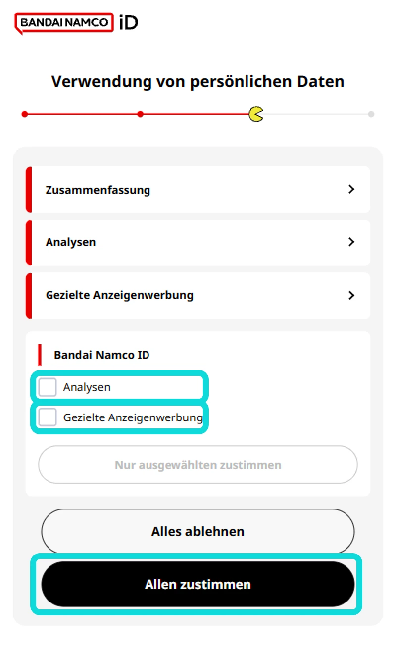 2.4- Sie haben jetzt erfolgreich eine Bandai Namco ID erstellt. Wählen Sie nach Wunsch die untenstehenden Punkte aus und klicken Sie anschließend auf "Allen zustimmen".