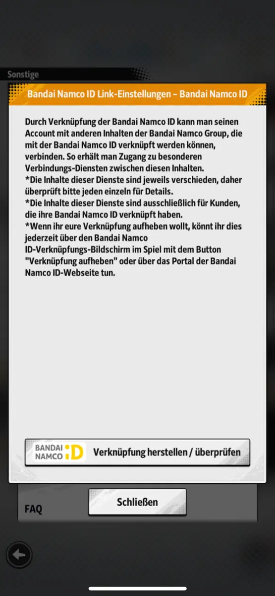 Eine Anleitung zur Verknüpfung findet sich auch auf der offiziellen Legends-Website unter"Bandai Namco ID-Verknüpfung".
