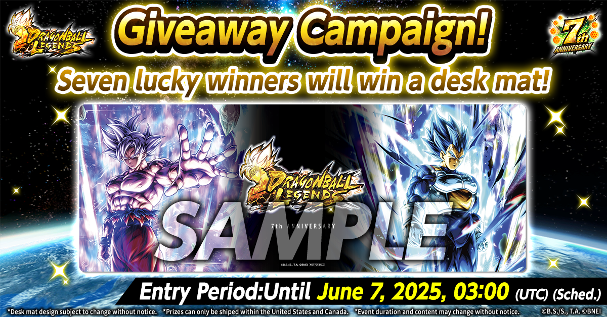 The Dragon Ball Legends 7th Anniversary Giveaway Campaign (“Campaign”) is open to individuals who are at least eighteen (18) years of age or the age of majority in their state (whichever is older), as of the start date of the Campaign. Employees of Sponsor and its affiliates, vendors, and their respective immediate families are not eligible to enter this Campaign. If the winner is found to be ineligible, Sponsor reserves the right to award the prize to another participant and to require the return on any prize already rewarded. THIS CAMPAIGN IS OPEN TO LEGAL RESIDENTS OF THE UNITED STATES AND CANADA ONLY. THIS CAMPAIGN IS VOID IN RHODE ISLAND, QUEBEC, AND WHERE PROHIBITED OR RESTRICTED BY LAW.