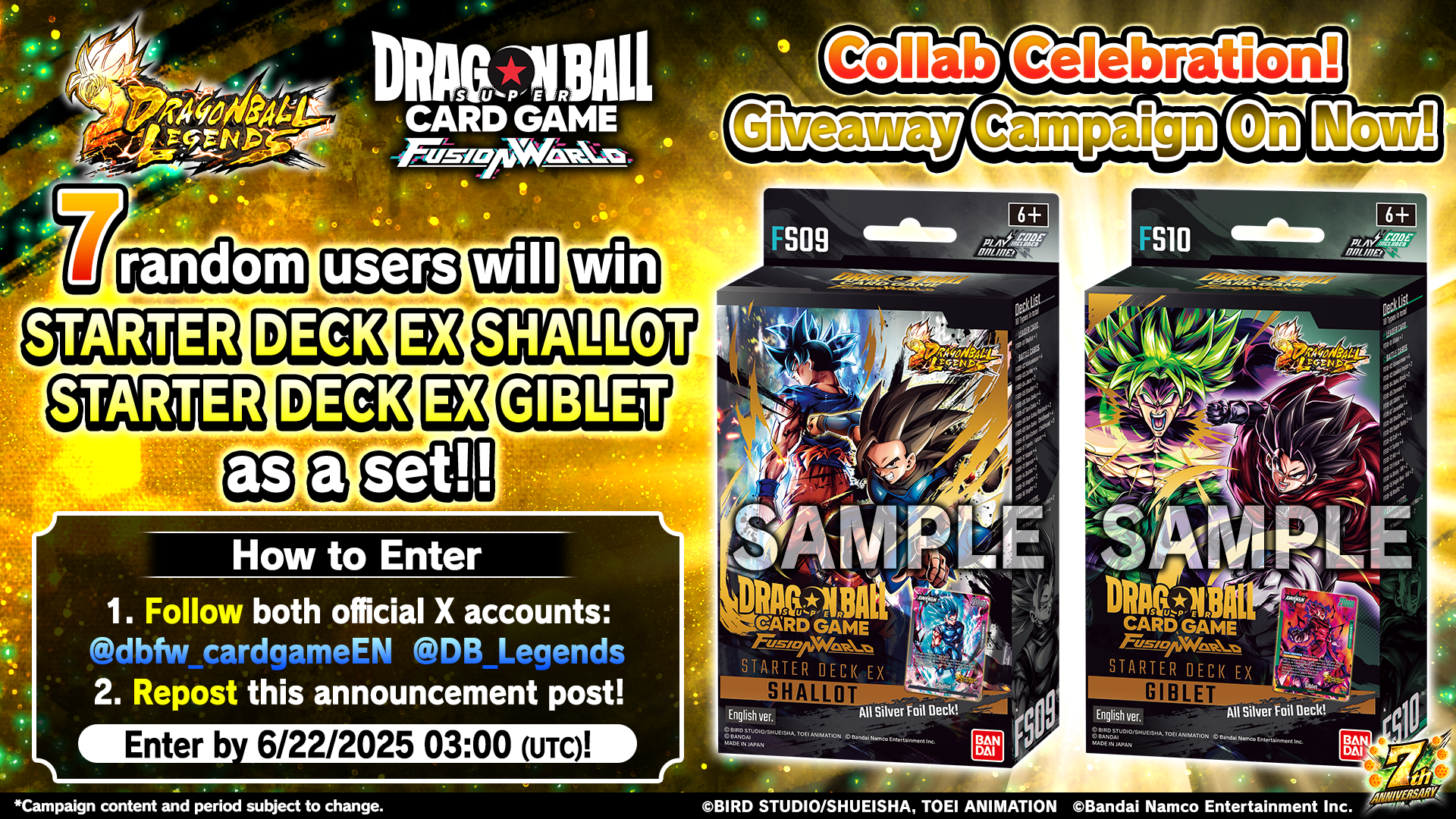 The “Fusion World Collab! Give Away Campaign” (the “Campaign”) is conducted by Bandai Namco Entertainment (the “Sponsor”). By participating in this Campaign, you agree to these rules (the “Official Rules”) and to the Bandai Namco Entertainment's Terms of Service available here: the “Terms of Service”. In the case of discrepancy between these Official Rules and the Terms of the Service, the terms of the Terms of Service shall apply. This Campaign is also subject to X Corp's rules available here.
